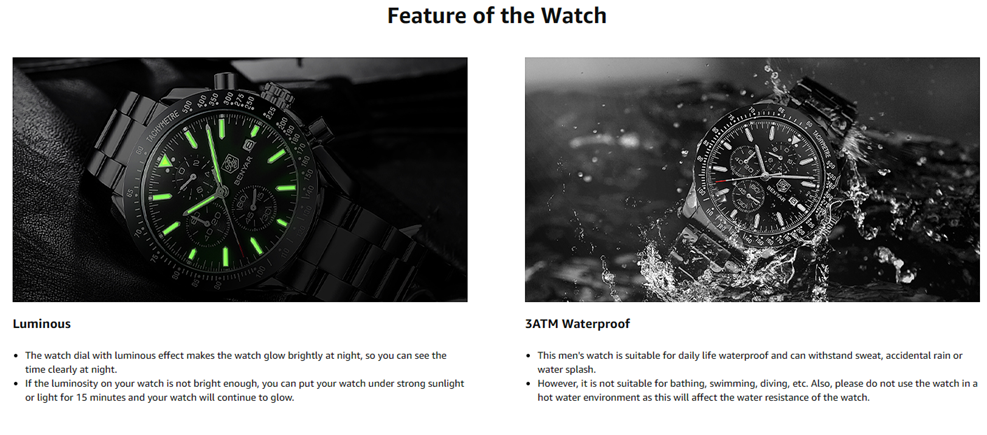 - ⌚ WATER & SCRATCH RESISTANT: The watch is water resistant up to 30M/98.4FT and can bear sweat, accidental rain or water splash. This watch is scratch resistant and provides a smooth feel. The durable stainless steel band is flexible and keeps your wrist ventilated.