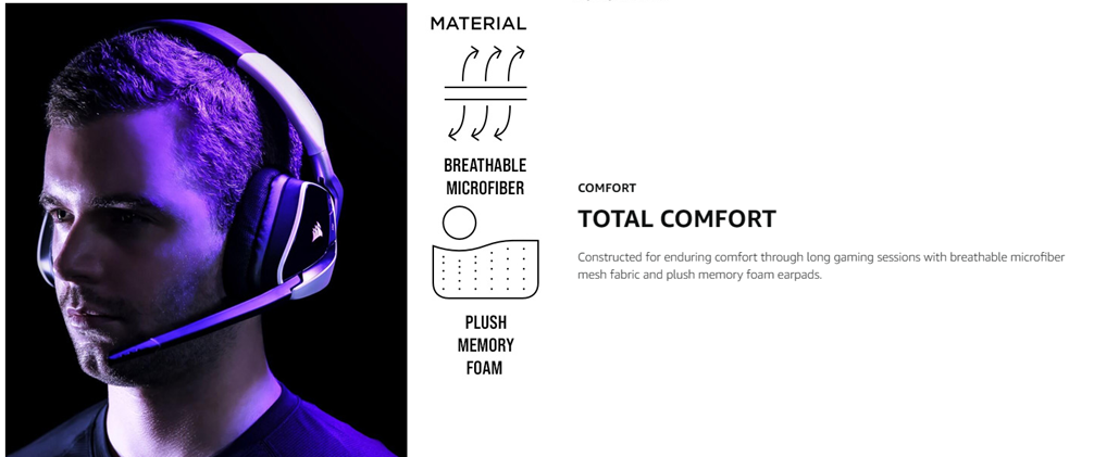 Immerse yourself in the action with the Corsair void RGB Elite wireless, with custom-tuned 50mm neodymium audio drivers delivering 7.1 surround sound on the PC. Microfiber mesh fabric and memory foam ear pads provide lasting comfort. Connect to your PC or PS4 with a low-latency 2.4GHz wireless connection, with a range of up to 40ft and all-day battery life up to 16 hours. An omnidirectional microphone with LED mute indicator ensures that you're heard with exceptional vocal clarity. The void RGB Elite's distinctive design and durable construction are complemented by fully customizable RGB lighting on each ear cup. Powerful Corsair iCUE software ties everything together, enabling full control over equalizer settings, 7.1 surround sound, RGB lighting and more.