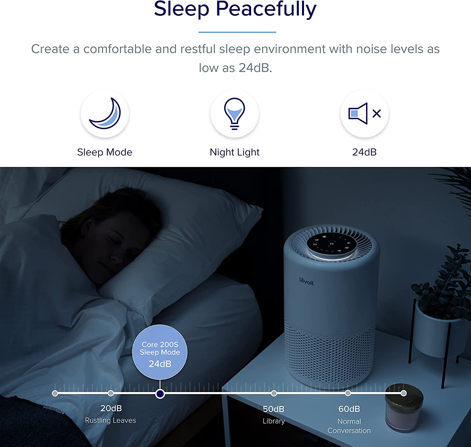- QUIET OPERATION: With noise levels as low as 24dB, the Core 200S cleans your air without keeping you up at night. For a completely uninterrupted sleep, turn off all lights with the Display Off button