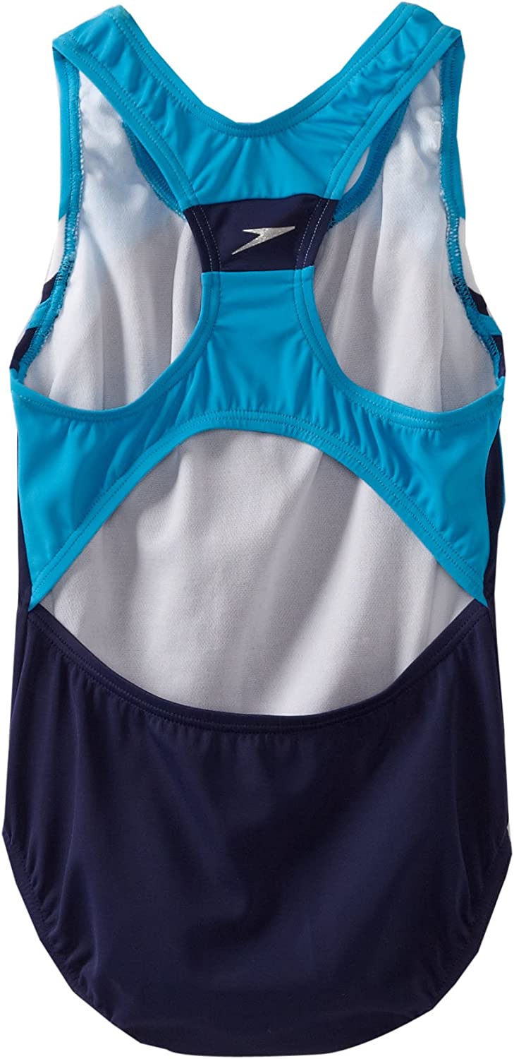 Speedo Boy's Size Charts Speedo Girl's Size Charts Swim laps around the competition in the Infinity Splice One-Piece Swimsuit. Xtra Life Lycra® Fiber: • Lightweight stretch fabric offers a wider range of motion in and out of the water.• Engineered to last over 200 hours in the pool.• Resists sagging, suntan lotion, oils, and chlorine. UV50+ Block the Burn protection from the sun's harmful UVA and UVB rays. Scoop neckline. Racerback design with cutout detail. No-Wedgie Worries offers silicone gripper at back legs for stay-put comfort. Moderate-rear coverage. 82% polyester, 18% spandex;Lining: 100% polyester. Hand wash, line dry. Imported. Measurements: One Piece Length: 19 in Product measurements were taken using size 8 Big Kids. Please note that measurements may vary by size. If you're not fully satisfied with your purchase, you are welcome to return any unworn and unwashed items with tags intact and original packaging included.