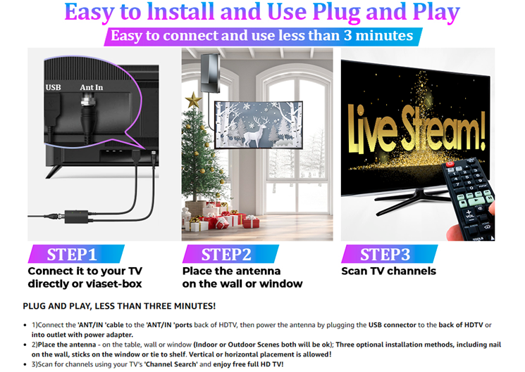 • ?▷【INDOOR/OUTDOOR ANTENNA FIT ANYWHERE 】- Easy install in Minutes. Give your home a modern decoration with this Unique and Fashional Design TV antenna. Three optional installation methods, including nail on the wall, sticks on the window or tie to shelf.Vertical or horizontal placement is allowed!You can place antennae in your home, underground garage , company, outdoor square for the best signal and the strongest reception. It also works as an outdoor antenna in RV or tent on your next trip!