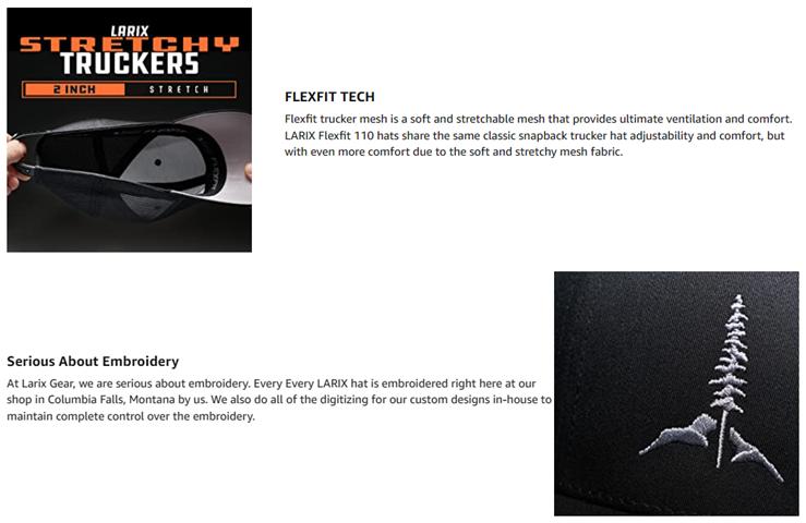 • FLEXFIT TECH - Flexfit trucker mesh is a soft and stretchable mesh that provides ultimate ventilation and comfort. LARIX Flexfit hats for men and women share the same classic snapback trucker hat adjustability and comfort but with even more comfort due to the soft and stretchy mesh fabric.