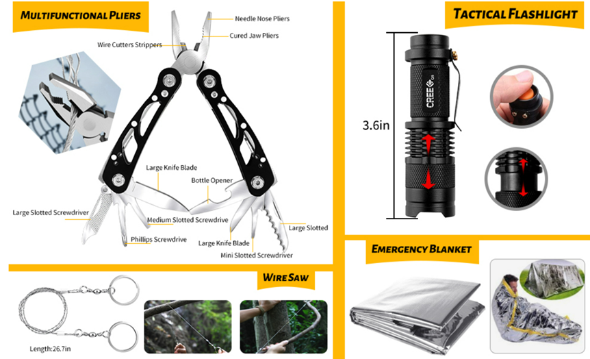 | Included Components | Whistle, Knife, Water Bottle Clip, Wire Saw, Flint, Tactical Flashlight, Hooks, Flashlight, Waterproof Box, Compass |