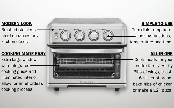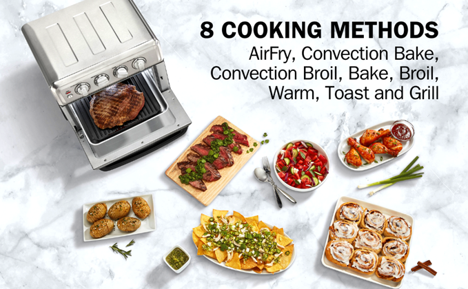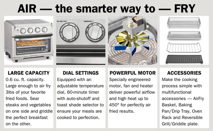 Cuisinart’s signature AirFryer just got even better! In addition to AirFrying french fries, baking cookies or warming up your leftovers, now you can make even more delicious meals in your Cuisinart® AirFryer Toaster Oven with Grill! Sear steaks and vegetables on one side and griddle the perfect breakfast on the other with the new dual-sided grill and griddle plate. Bring next-generation cooking to your countertop with the spacious 8-function oven that makes cooking a feast for family and friends — or a simple snack for one — fun, fast, and easy!