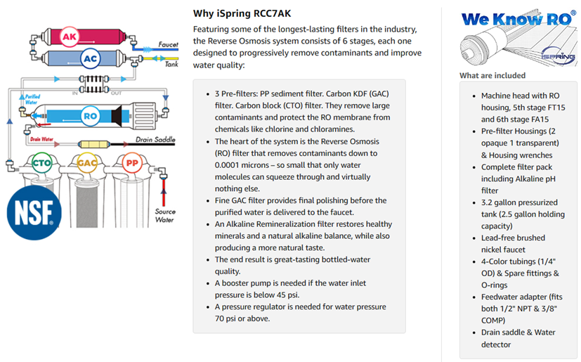 • GREAT-TASTING MINERAL WATER - A standard 5 stage RO system produces slightly acidic water with a pH of 7. 0 or below because the RO membrane removes not only harmful pollutants but also a few helpful minerals. The iSpring RCC7AK Reverse Osmosis water filter includes an additional 6th stage - an Alkaline Remineralization filter which restores healthy minerals and produces a balanced alkalinity, which gives your water a more natural taste than regular 5 stage RO water filter.