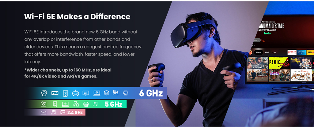 - Wi-Fi 6E Makes a Difference:More capacity in the 6 GHz band, which solves connection and congestion issues. Wider channels, up to 160 MHz, are ideal for 4K/8k video and AR/VR games.Less interference because only 6E-capable devices can use the band.