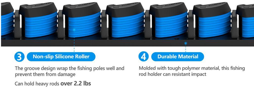 - DURABLE AND SOFT MATERIAL - The PLUSINNO fishing rod rack is molded with tough polymer material, sustained and sturdy in texture, not easy to bend, deform or break.The grips pad are made of soft silicone material with an innovative textured design of raised dots and grooves, which can ensure rods and combs are held securely. It can firmly hold more than 2.2 lbs of fishing rod and reel combos.The 3 grooves can wrap the fishing poles well and prevent them from damage.