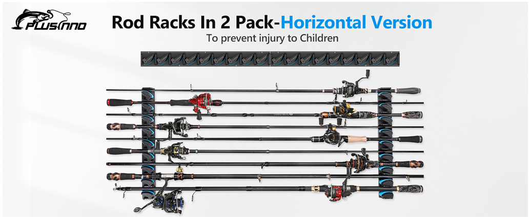For 2 pack PLUSINNO fishing rod racks, there are 2 option of installation for you to organize the fishing rod and reel combos: Vertical Style and Horizontal Style. The horizontal version can store rods on the high wall to prevent injury to kids.