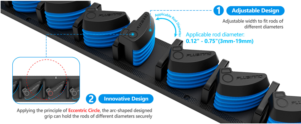 - INNOVATIVE GRIP DESIGN - This fishing rod rack adopts an innovative structure. Applying the principle of eccentric circle, the arc-shaped designed grip roller can hold the fishing rods of different diameters firmly and securely. PLUSINNO fishing pole racks perfectly solves the problem of uneven force on different diameters fishing rods to ensure rods and combos are held securely in your rack which prevents your expensive rods from sliding down and damage.