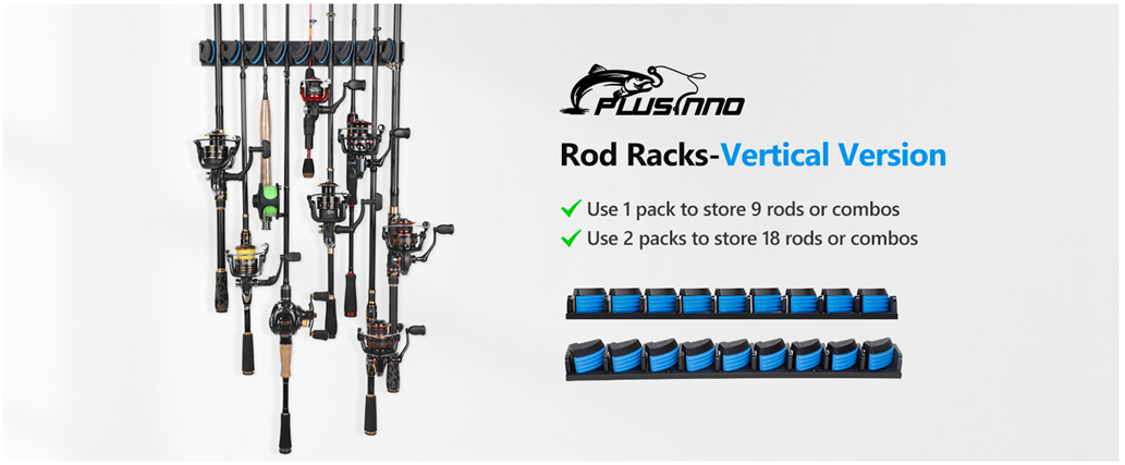 - 2 PACK STORE 18 RODS OR COMBOS - The PLUSINNO fishing pole holder in 2 packs can store up to 18 rods or combos vertically or store 9 rods and reel combos in horizontal version, which meet the different storage needs. Fishing rods and reel combos can be mounted on the rack at any position of rod length, which make the reels can be staggered at different heights to minimize storage space.