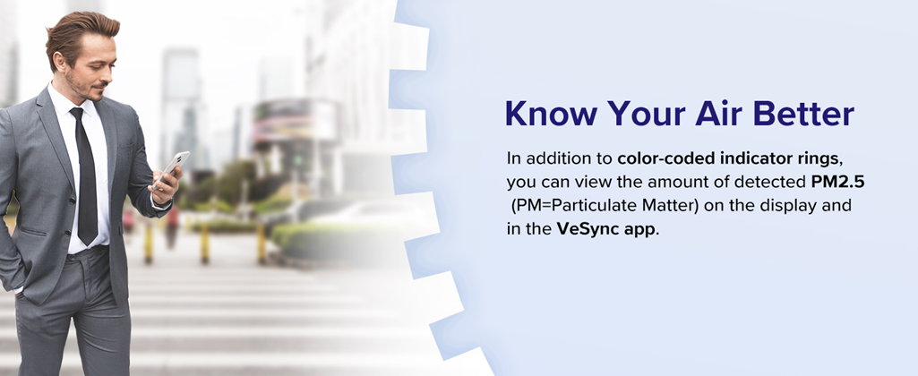 - Automatically senses and reacts to changes in air quality - then reports pollution in real time on LCD screen and on your free VeSync Link app.