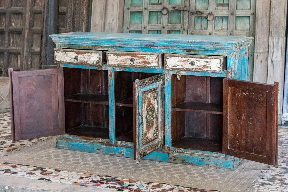 Antique Indian Brass Work Hand Carved Solid Wooden Sideboard Bluewash Mango Wood Indian Arched Sideboard Cabinet Storage Units Indian Solid Wood Finish,Living Room Bedroom Furniture,Modern Sideboard