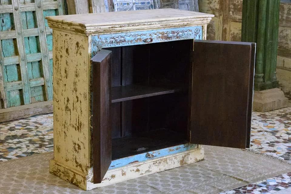 Antique Indian Brass Work Hand Carved Solid Wooden Cabinet Whitewash/Blue, Cabinet Storage Units Indian Solid Wood,Living Room Bedroom Furniture,Modern Cabinet